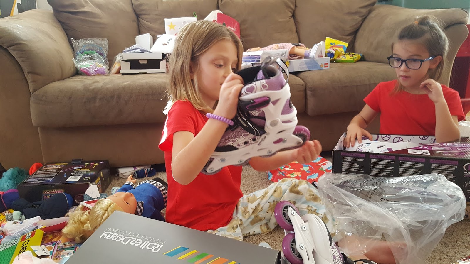 We had the girls each open one gift and then we let the twins open all of theirs. They didn't have too many and it was fun to watch. Then we put them down for a nap while we finished opening presents. It was driving Tia nuts having to wait so long for her presents, but she did it and it was really fun. Everyone got some good things. The girls gift from us this year was roller blades, so once the twins were up we all went to the park where there is a roller rink and Gaupo took care of the twins while the girls and I roller bladed. We have been a few times since and they are getting really pretty good. I am very impressed at how they stick with it. I think its very fun and relaxing. After the park, it was leftover dinner for lunch and then naps for Gaupo and the twins and play time for the rest of us. The girls I played some of the games we got, the girls roller bladed and we did some video chatting. When the twin woke up, we worked on organizing the Christmas Bomb, so that you could sort of see the living room floor and opened the twin gift from us which was new carseats! So, exciting huh;) The twins loved them though and were having a great time sitting in them and climbing on them. They loved it. Then we decided if we were going to put them in the car and end the fun we might as well make it worth it, so we put them and then went and looked at Christmas light. The twins loved their seats, we found one house that was super awesome and quite a few others that were really nice. We listened to Christmas music and just enjoyed each other. When we got home we had dinner, put the twins to bed, let the girls stay up and watch a movie. Then it was bed time. I think it might have been bed time for everyone.